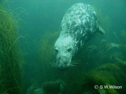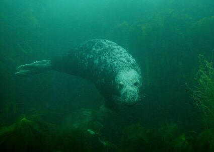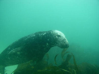 Seals can be found in many areas of Cornwall, most most notably the extreme west and north coasts, but I have been 'buzzed' by seals of Pendennis point Falmouth and St. Mawes light house. Grey seals are frequent visitors to Newquay harbour, where up to 5 can be regularly seen. The photo's here were taken off Treen cove on the north coast, on a most memorable dive. I tried to find some safety information on diving with seals but couldn't find anything significant. However, common sense would suggest that they have big teeth so caution is advised, don't hassle them, don't corner them and let them come to you, if they want to! If you have any reliable advice please let me know.