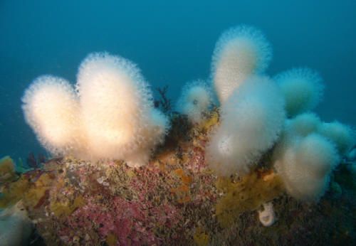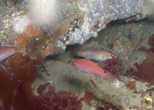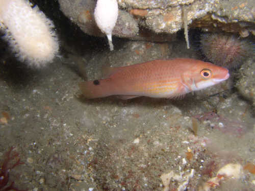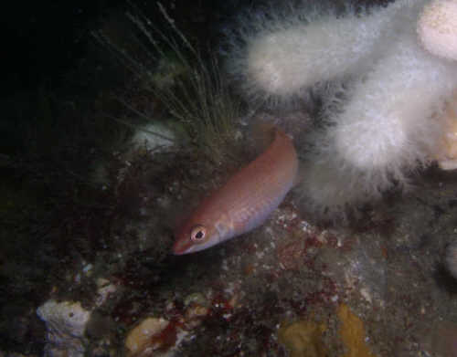 I have to say that I don't think I've dived the "Old walls" properly, hence the heading "Old Walls Reef". However we have dived "in the vicinity of the Old Walls" several times. Each dive has been unspectacular but enjoyable. The area we've dived, about a mile south of St. Anthony lighthouse, has flat rock and course sand with a good deal of marine life, including all the usual wrasse species; ballen, cuckoo, goldsinny and rock cook, with pollack, and dogfish. On one dive I saw six male cuckoo wrasse, which really surprised me as I thought they were highly territorial and had one male to a harem of females (any info please?). Some very pleasant scenic diving is to be had out here, but watch the boat traffic!