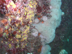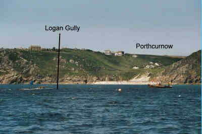 Aerial View Just off the extreme south-western edge of the Logan rock promontory, lie two large lumps of granite. They are on a sandy bottom in about 10m of water and are separated from each other by a narrow gully- Logans gully. The sand is course and settles quickly to give super visibility. The walls of the gully are home to a variety of invertebrate life making it ideal for macro photography. On a larger scale, I remember one dive lying on the seabed watching pollack dart in and out of a large shoal of sand eels. The surrounding area is often visited by basking sharks in summer months. Well worth a look!
